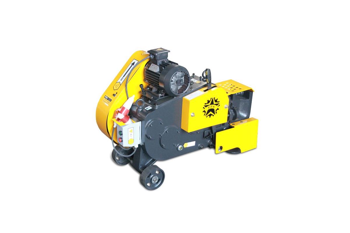 Станок используется на стройках и железобетонных заводах для резки арматуры любого сечения, предназначен для резки стального круглого проката и арматурной стали. При необходимости за один раз может разрезать 2-3 стержня. Для удобства перемещения станок оснащен съемными колесами и рым-болтами для поднятия краном. Имеет два вида управления: педальное и ручное. Возможность работы до минус 30°. Малый вес, компактность, защищенный корпус. Напряжение сети, В 380 Мощность,кВт 3 Частота хода ножа, 1/мин 48 Резка арматуры класса А-I (А240) диаметром, мм 42 Резка арматуры класса А-III (А400)) диаметром, мм 36 Резка арматуры класса А-500С диаметром, мм 32 Резка арматуры класса Ат500 диаметром, мм 32 Габариты,мм 1250х620х960 Вес, кг 530 Масло, л 8 Станок для резки арматуры Р-42 применяется в производстве железобетонных конструкций, предназначен для резки арматурной стали круглого и квадратного сечения. Его высокая производительность достигается за счет увеличенной частоты хода ножа. Эта модель обладает высокими показателями надежности, безопасности и эргономичности. Принцип работы и особенности станка для резки арматуры Р-42 На станке Р-42 двигатель через маховик и редуктор передает вращение на кулисный механизм. Таким образом реализуется возвратно-поступательное движение ножа, и, соответственно, резка арматуры. Станок для резки арматуры Р-42 имеет следующие характеристики: редукторная система имеет две передаточных пары и находится в масляной «ванне»; ручное и педальное управление, что обеспечивает удобство работы для оператора, может работать 1 человек; возможность одновременной резки двух и трех стержней арматуры, установлена система защиты электродвигателя УЗО; компактность, вандалозащищённый корпус; удобство переноса оборудования обеспечивается колесами, на которые опирается станок (можно снять при стационарном использовании), а также специальными рым-болтами для зацепа крюком подъёмного крана (удобно при перемещении с этажа на этаж); 8 кромок резки у ножей (квадрат), срок службы комплекта ножей при непрерывном использовании — более 45 рабочих смен; максимальный диаметр арматуры класса А-I составляет 42 мм, класса А-III составляет 36 мм.